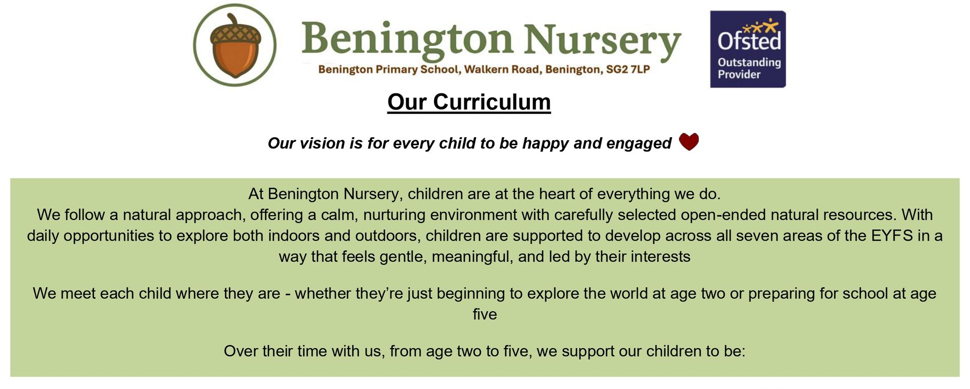 At Benington Nursery we support every child in developing to their full potential at their own pace. By means of developmentally appropriate play activities, in the moment planning, outdoor learning and individual adult input, we offer a curriculum which enables the children to progress towards the early learning goals by the end of the foundation stage.